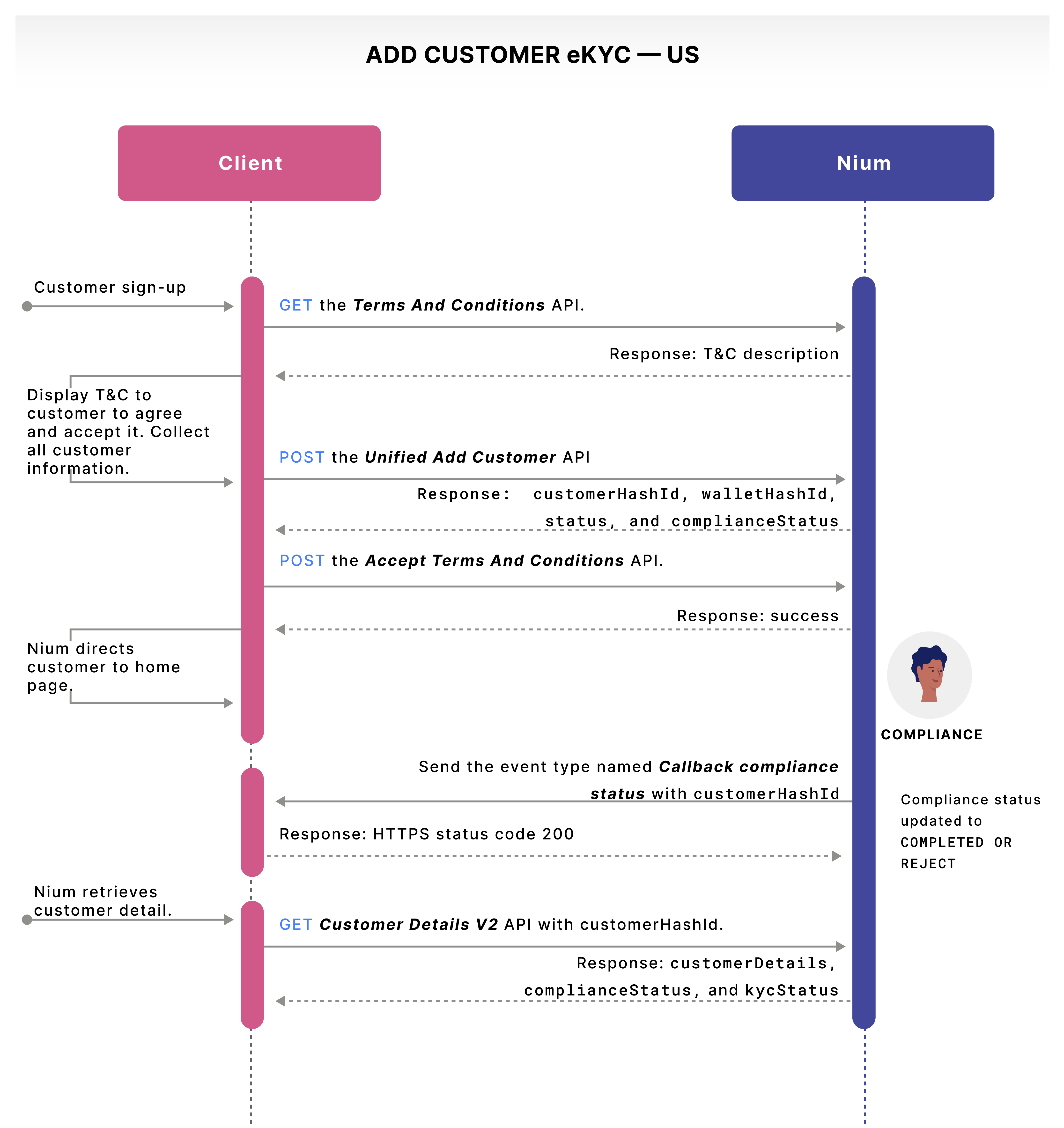 POSTrequest to the Unified Add Customer API as per US required parameters - Nium sends a CUSTOMER_COMPLIANCE_STATUS webhook with